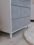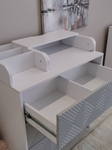 🔸Три шухляди на телескопічних направляючих🔸Відкриття і закриття шухляд від натискання на них🔸Різьба на фасадах шухляд - особливість цієї моделі 🔸 Верхня шухляда розділена на дві частини для зручного зберігання дрібних речей 🔸 З'ємний і розкладний сповивальний блок з органайзером 🔸 Функція кріплення до стіни для безпеки малюка 🔸 Матеріал - високоякісне ДСП, фасади МДФ, ніжки - дерево Розмір комода (ш*в*г): 90*85,2*49,3 смРозмір сповивального блоку (д*ш*в): 70*53*10 смВисота ніжок: 11 см Шухляди Внутрішній замір: 1 верхня шухляда розділена на дві секції: 39,5/39,5/13 см2-3 шухляди: 80,5/39,5/13 смВага - 40 кг ‼️7 Кольорів фасадів: айворі, білий, графіт, сірий, темно-зелений, м'ятний, лате. Гарантія - 18 місяців. ❗️Відправляється із зібраним корпусом.