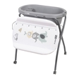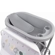 Дитяча ванночка зі сталевою стійкою, 4 колесами з гальмами, поличкою для зберігання та м'яким пеленальним матрасиком із ПВХ із принтом і шкалою для вимірювання зросту малюка. Ванночка виготовлена з якісного та міцного пластику з легкою матовою поверхнею і має знімну підтримку для купання. Також є багато місця для мила та шампунів. Стійка складається при знятті ванночки, що робить її ідеальною для невеликих ванних кімнат. Пеленальний матрацик прикрашений милим принтом зі слониками. Ванночка оснащена зливною пробкою та трубкою для зручного зливу води. Дуже практична, компактна у складеному вигляді та проста в догляді. Розміри: 82 x 64 x 102 см.